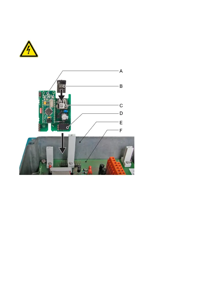 3. Insert the USB interface with the plug [D] facing towards the mainboard [F] into the