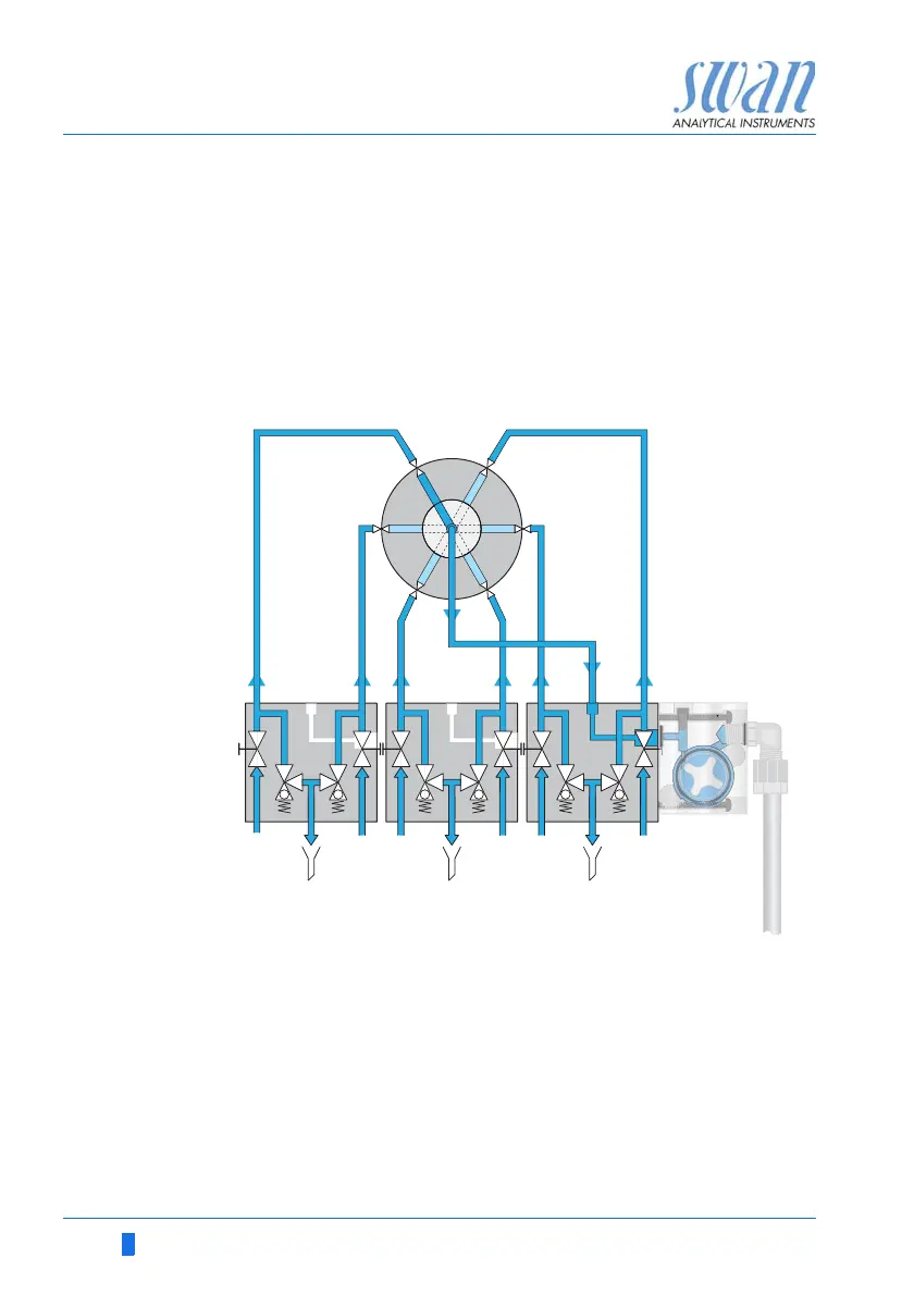 [G]. The sample flows through the active sample line via 6-way