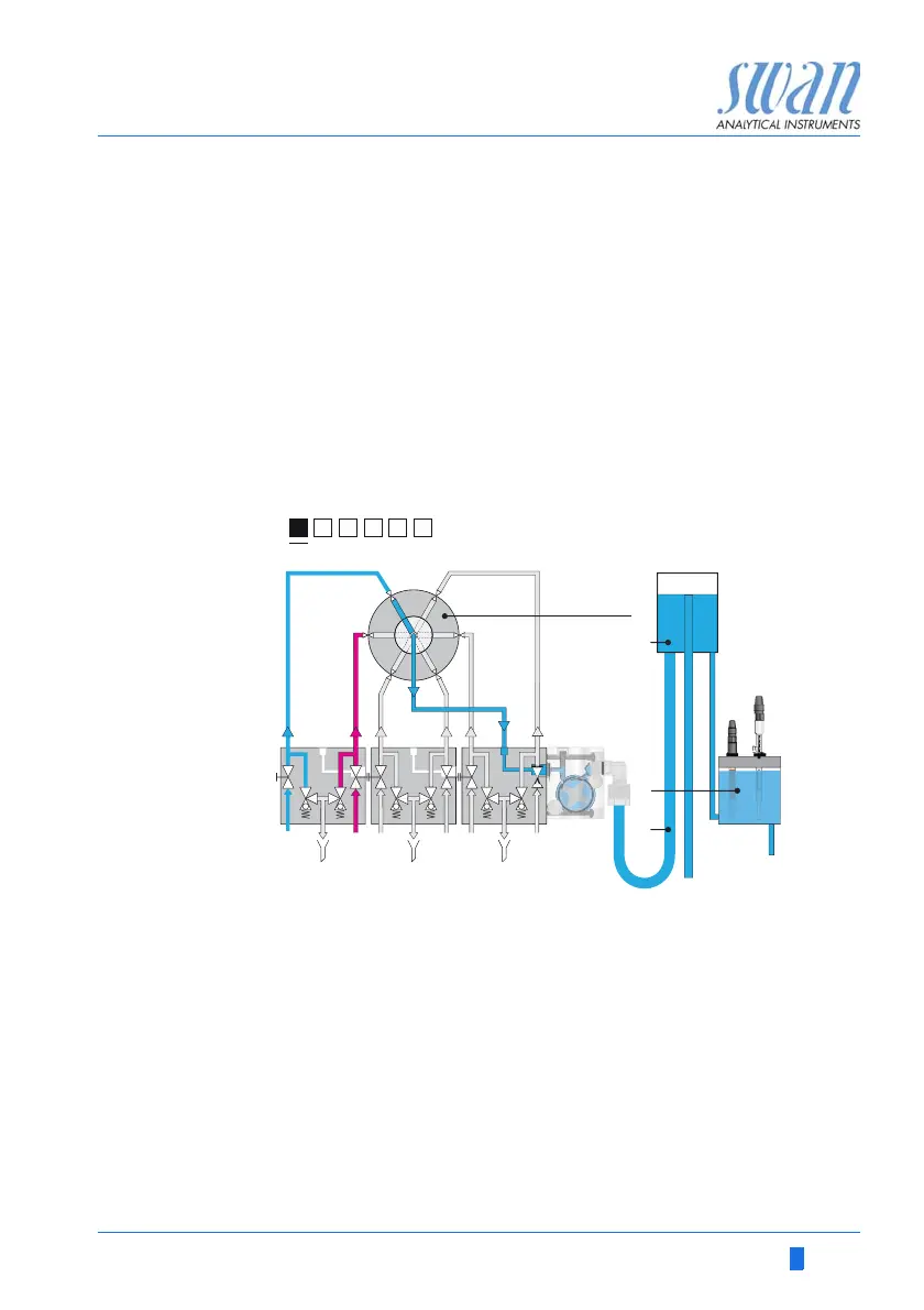 Step 1 The 6-way valve [A] is on position 1 and sample stream 1 [D]