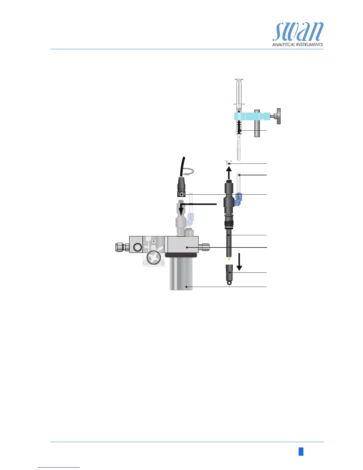 3 Insert the electrode through the flow cell block [F] into the cali-