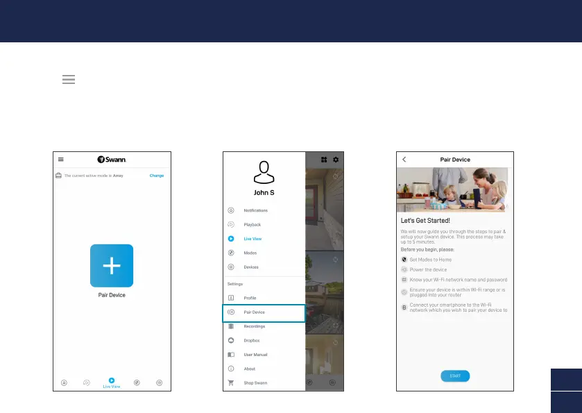 Launch the Swann Security app and sign in. Tap the Pair Device button on the screen (or tap the menu
