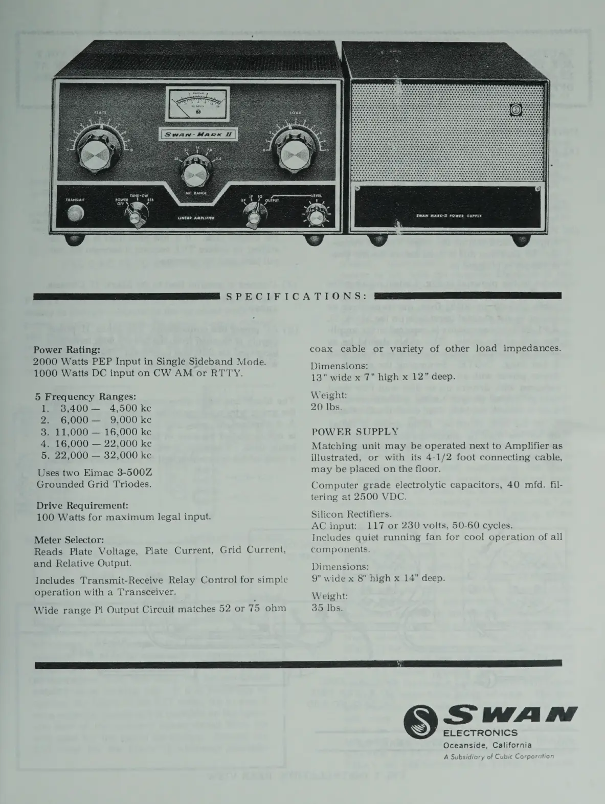 Swann MARK II - Technical Specifications; Amplifier Power and Frequency; Drive and Metering; Power Supply Specifications