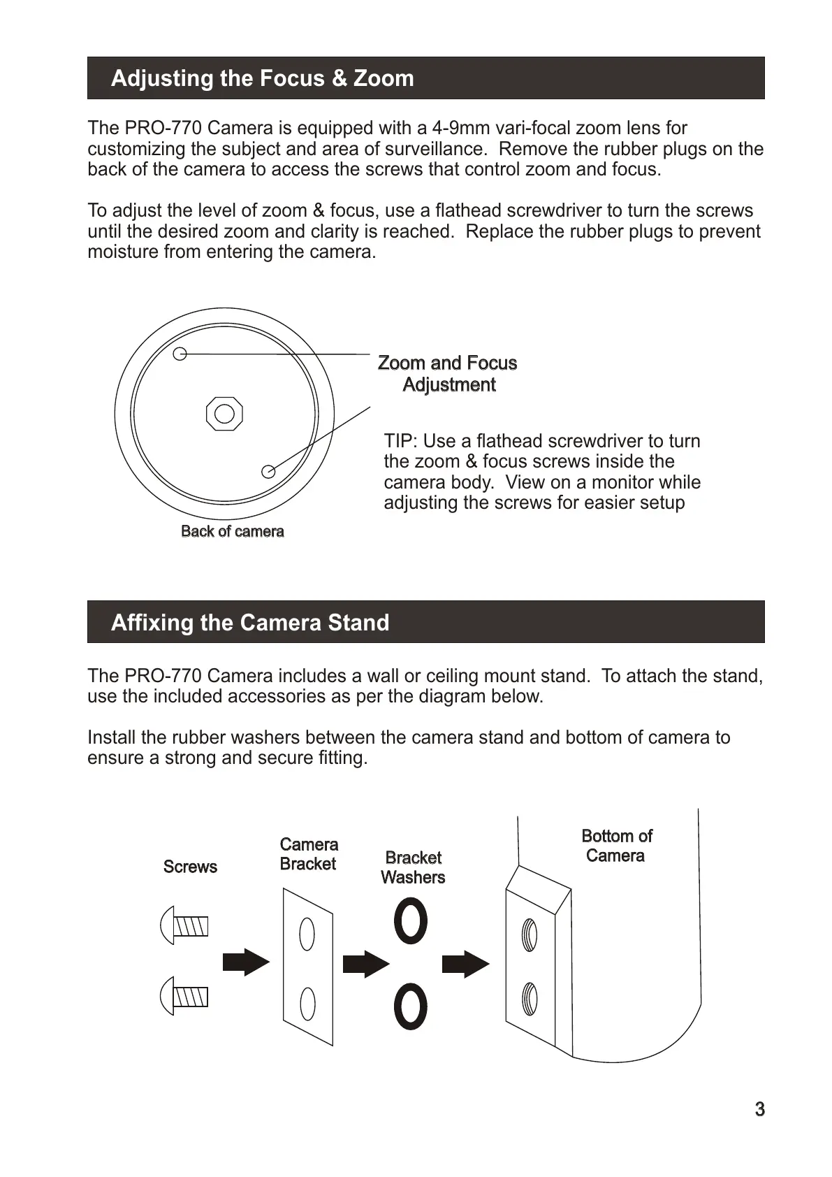 The PRO-770 Camera includes a wall or ceiling mount stand. To attach the stand,