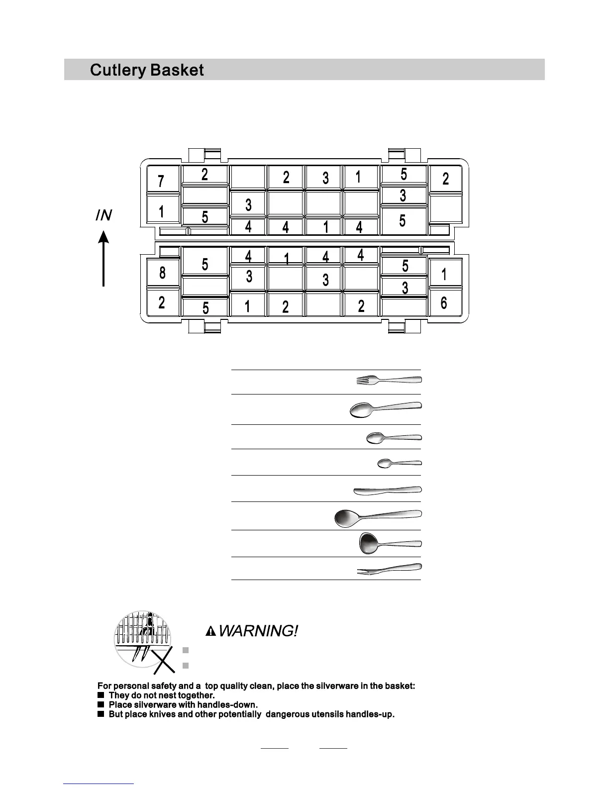 should be loaded individually into the appropriate slots, especially long utensils should be placed in the horizontal