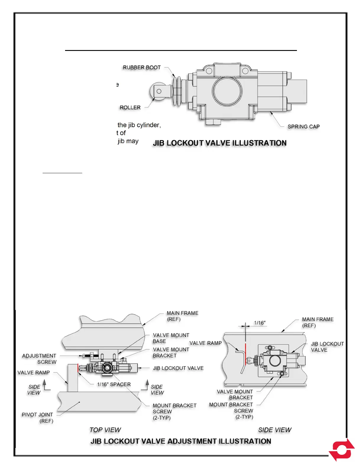 the jib lockout valve roller. The roller should be depressed by the valve ramp by 1/4" to 5/16”.