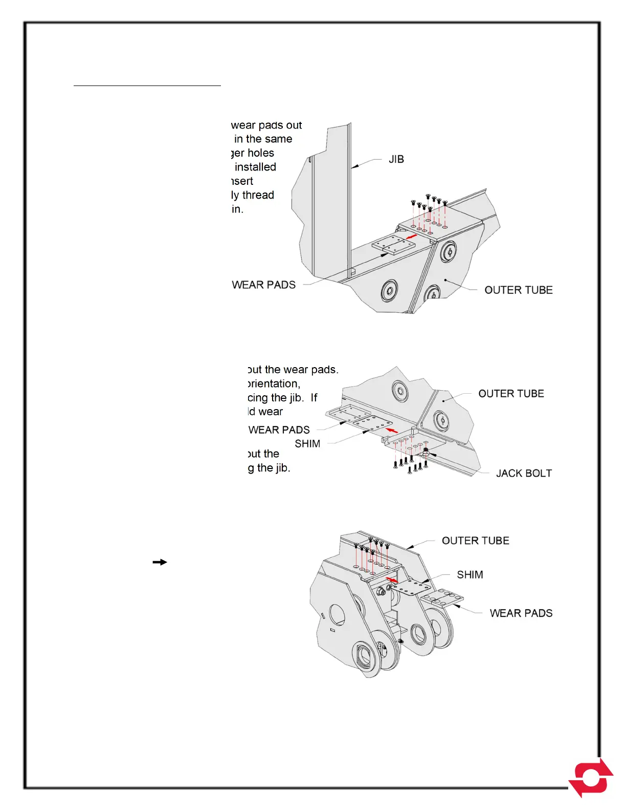 replacement. Insert a 3/4-10 bolt into this hole and raise the jib until weight is taken off the wear