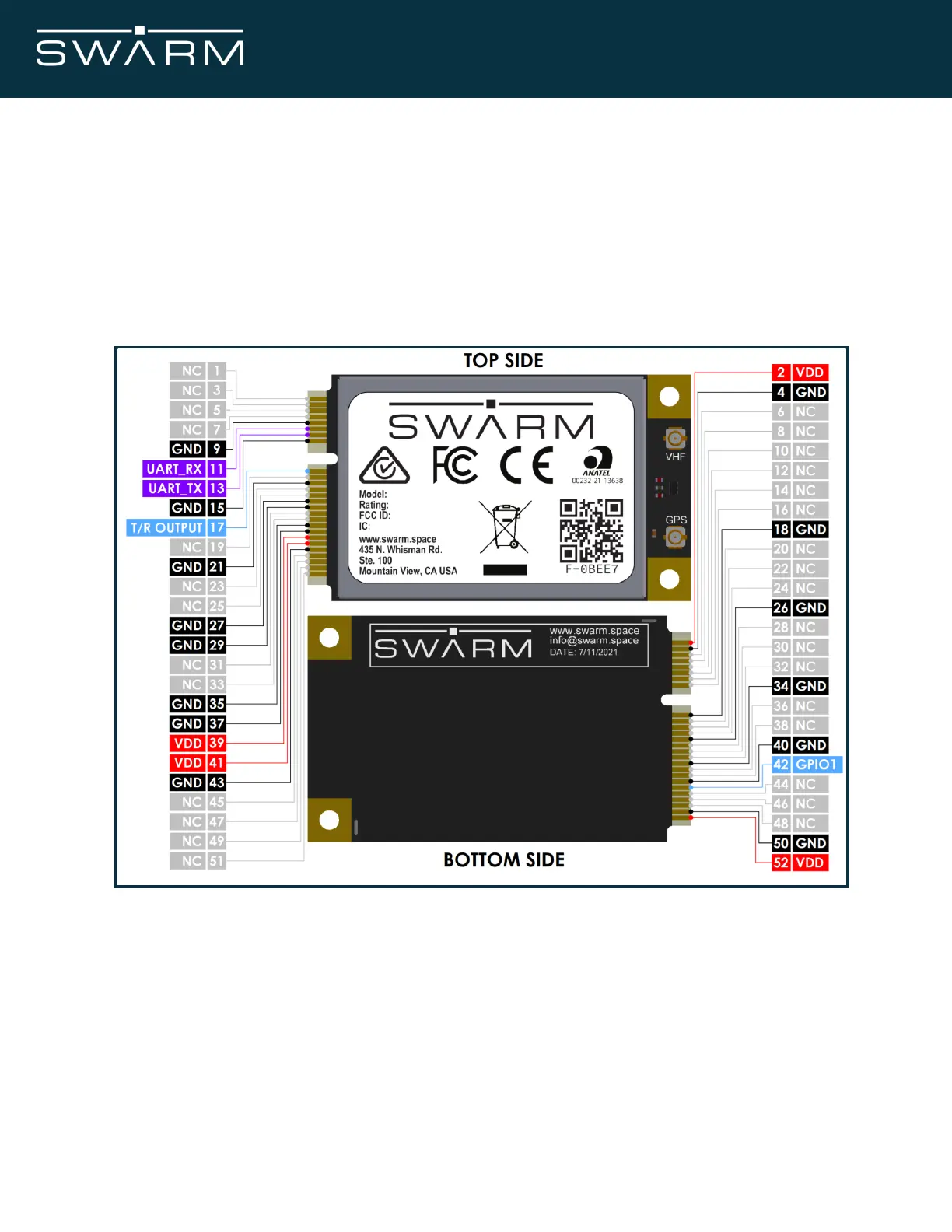 The pin numbering scheme of the Swarm Modem is shown in Figure 4. All pins are located on