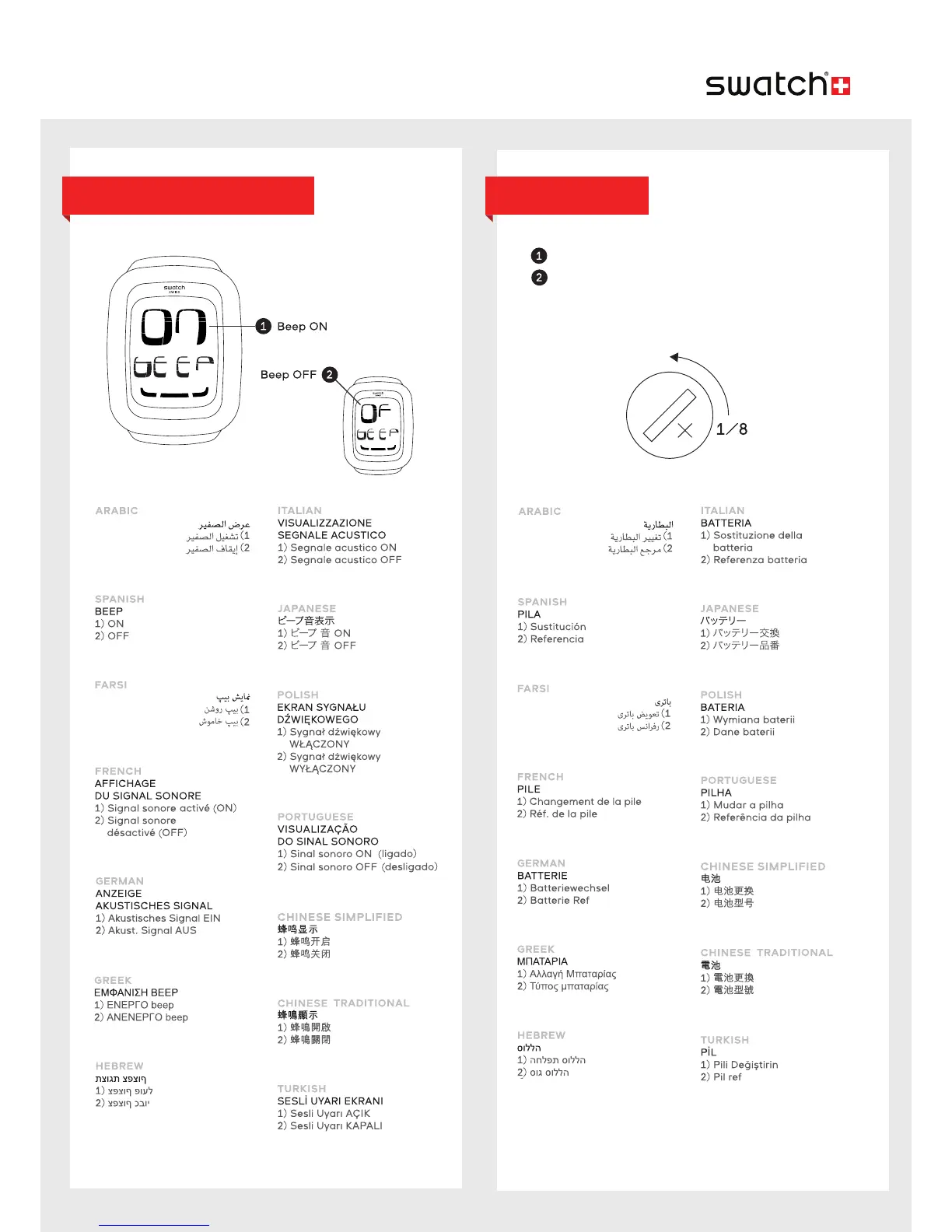 Swatch SWISS - Beep Display Modes (K); Beep ON;OFF; Battery Information; Battery Replacement and Reference