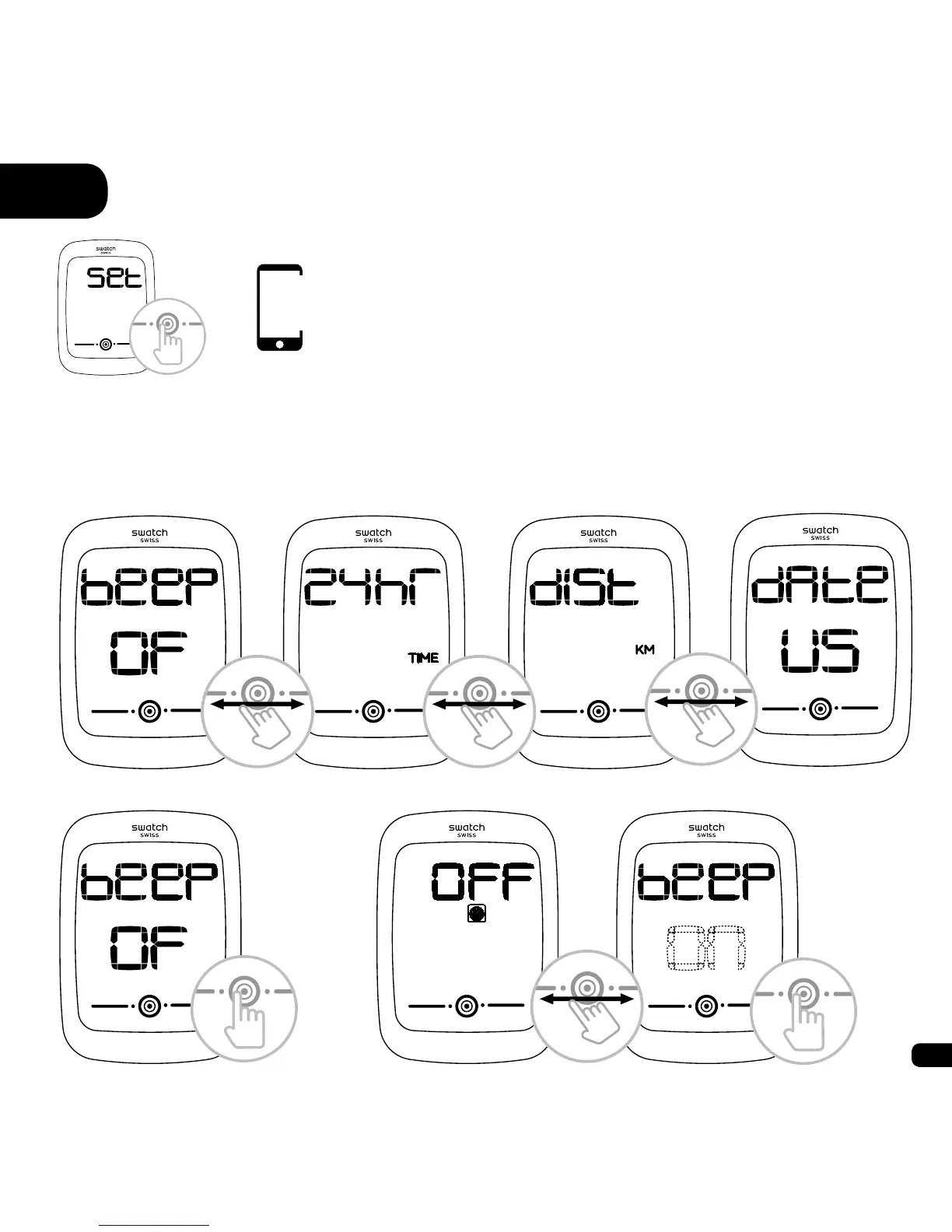 Swatch Touch Zero One - 5 Set; All settings can be changed in the app; Settings (Beep, 24 h;12 h, km;mi, Date EU;USA)