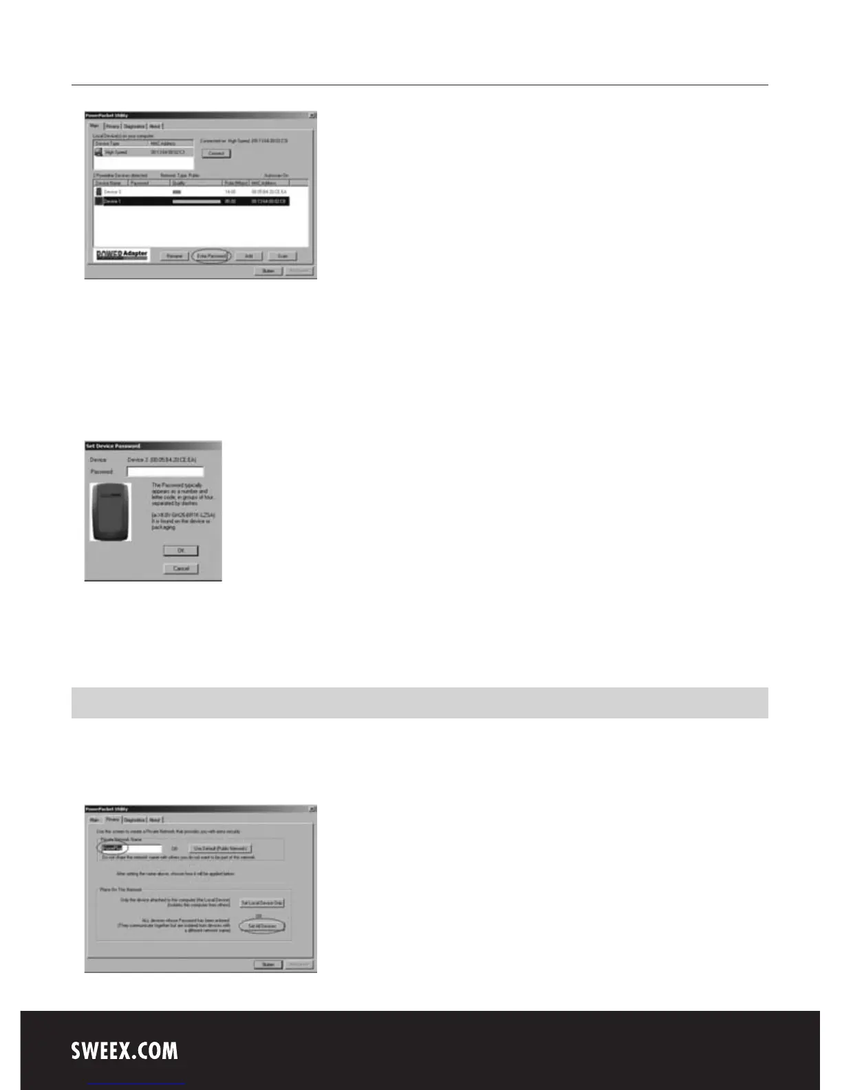 via the electric mains. The devices will be listed in the window under “Device name”. This will further detail the password (empty by default), the