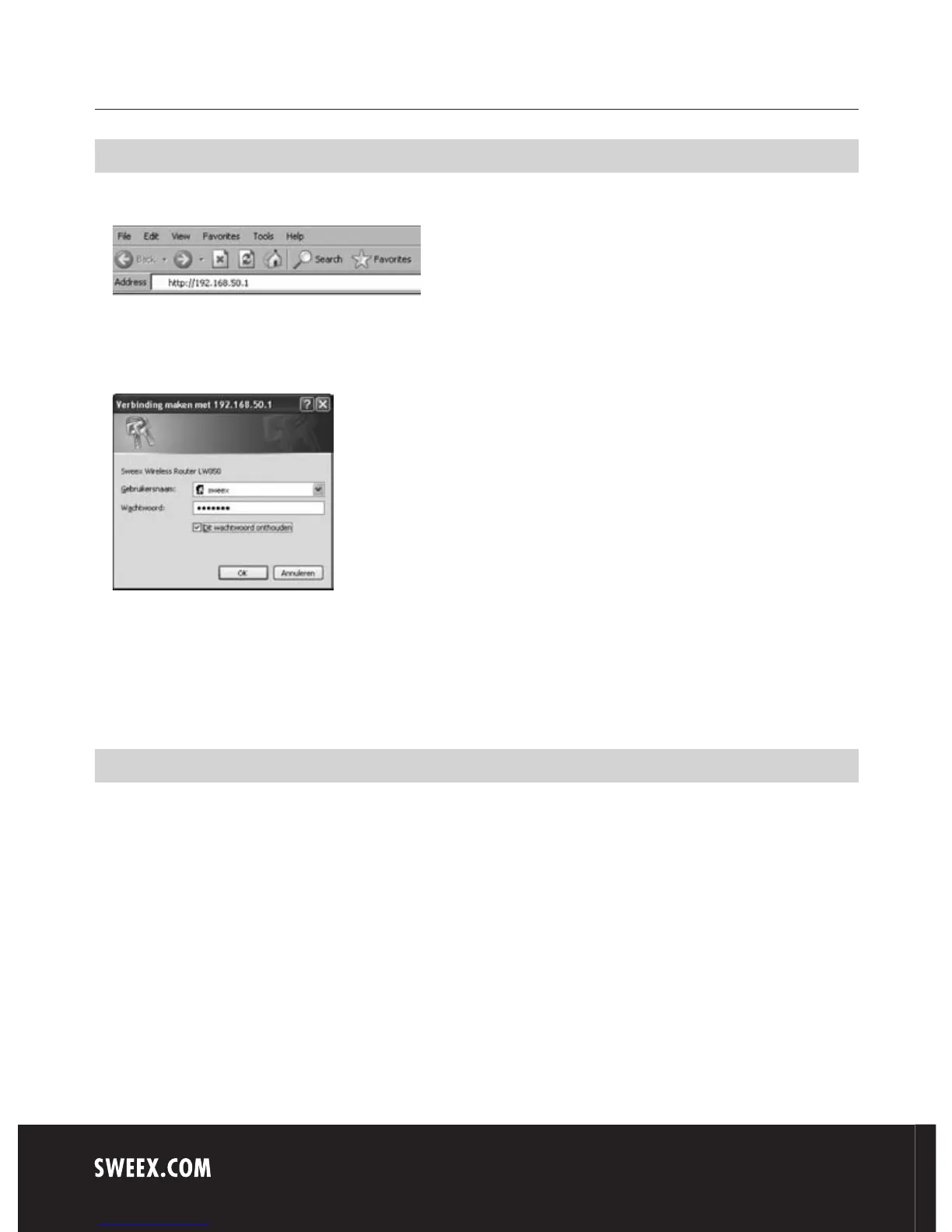 The router login screen appears. Fill out the login name and the corresponding password. The standard login is sweex and the corresponding