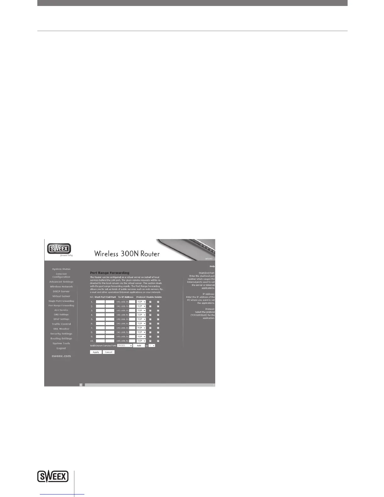 Tosetupportforwarding,logintotherouterasdescribedinthe“Advancedsetup”chapterandclick“VirtualServer”–“PortRangeForwarding”in