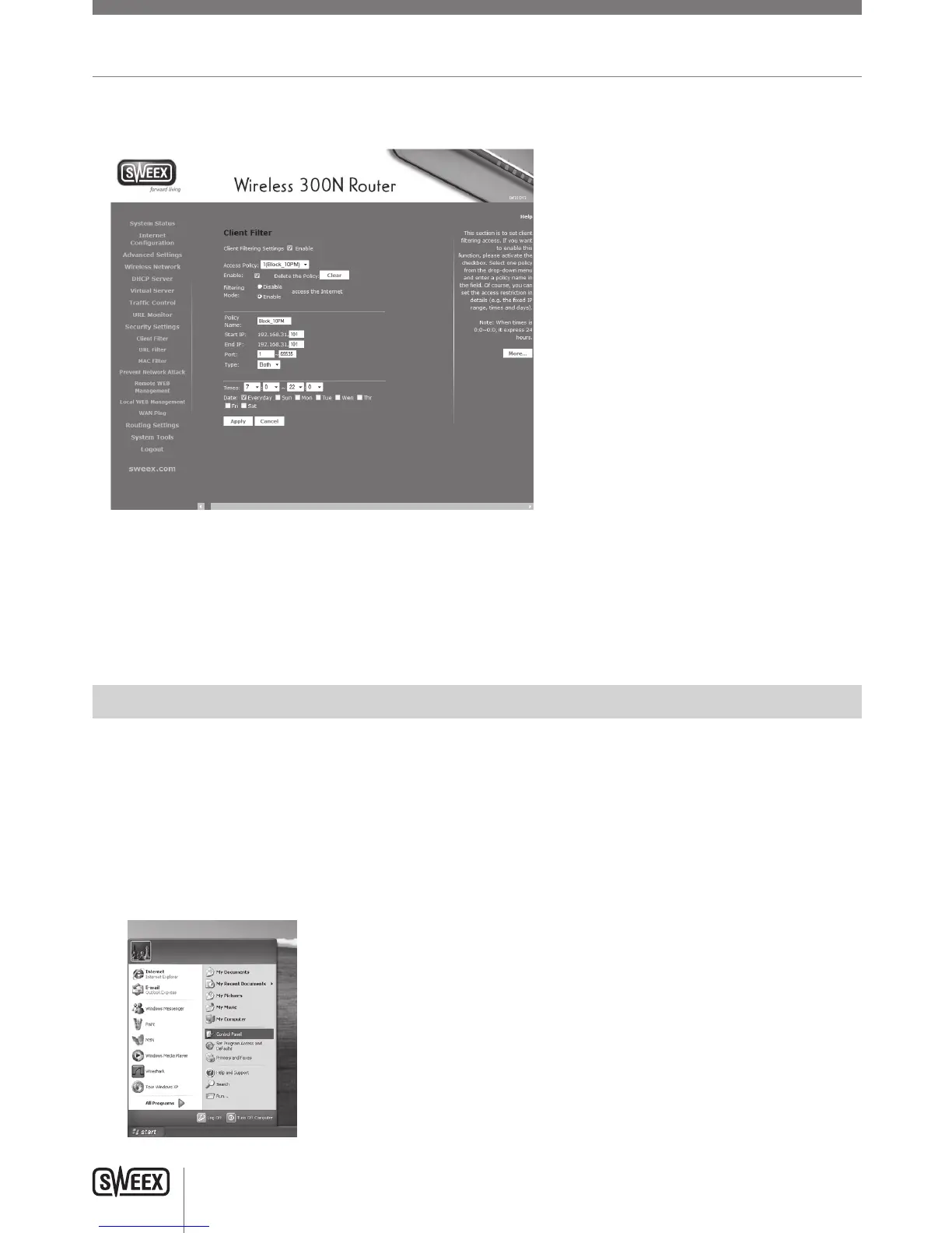TosetuptheClientFilter,logintotherouterasdescribedinthe“Advancedsetup”chapterand,“SecuritySettings”inthemenuontheleftand