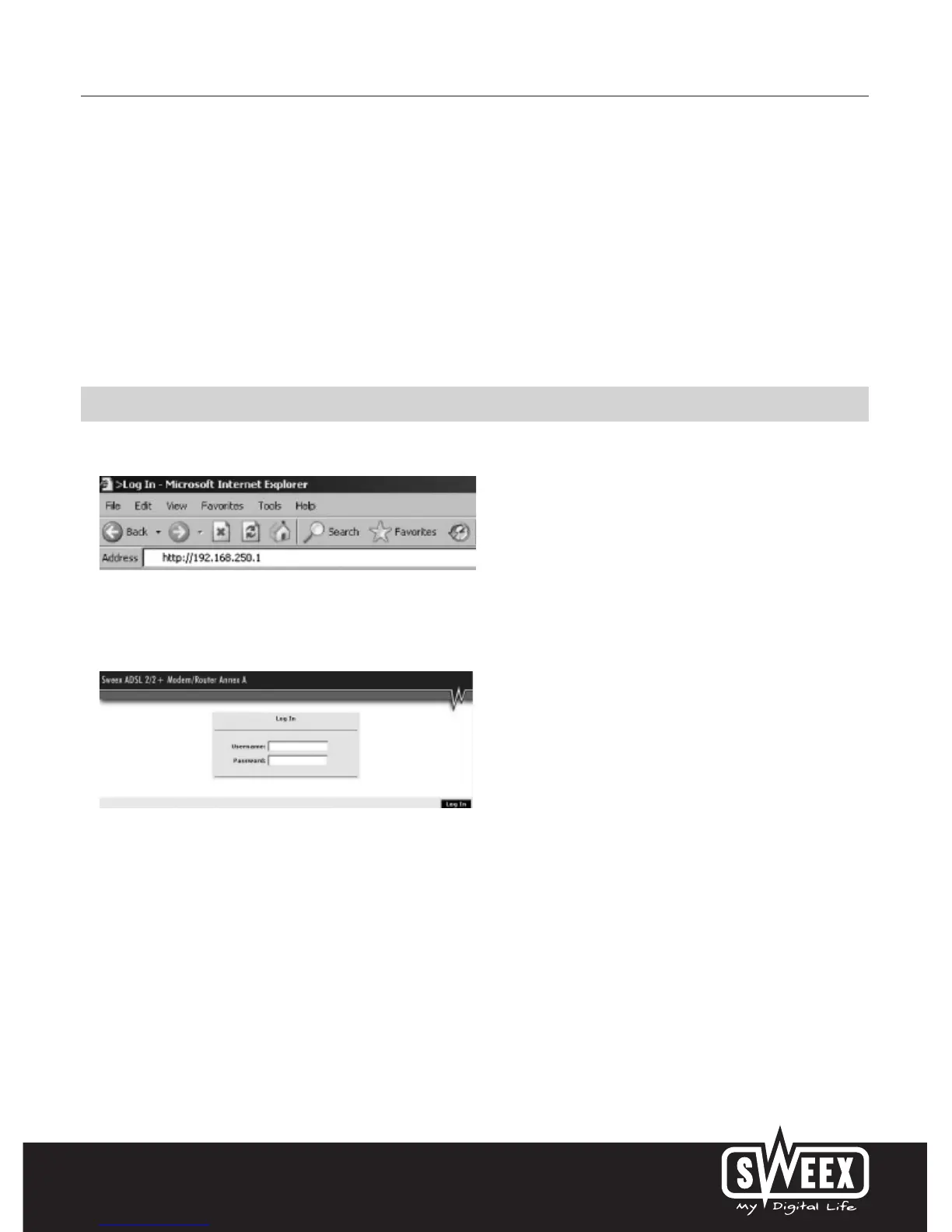The modem login screen appears. Fill out the login name and the corresponding password. The standard login is “sweex” and the corresponding
