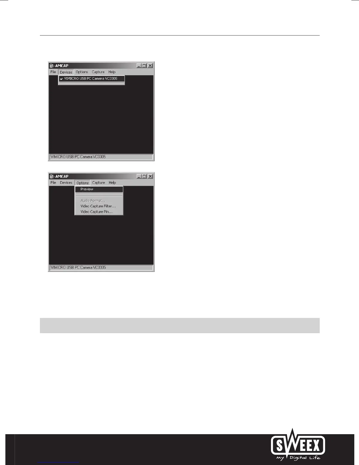 In AMCAP open the “Devices” tab. Make sure that here the correct chatcam is selected: “Sweex Nightvision Hi-Res Chatcam”.