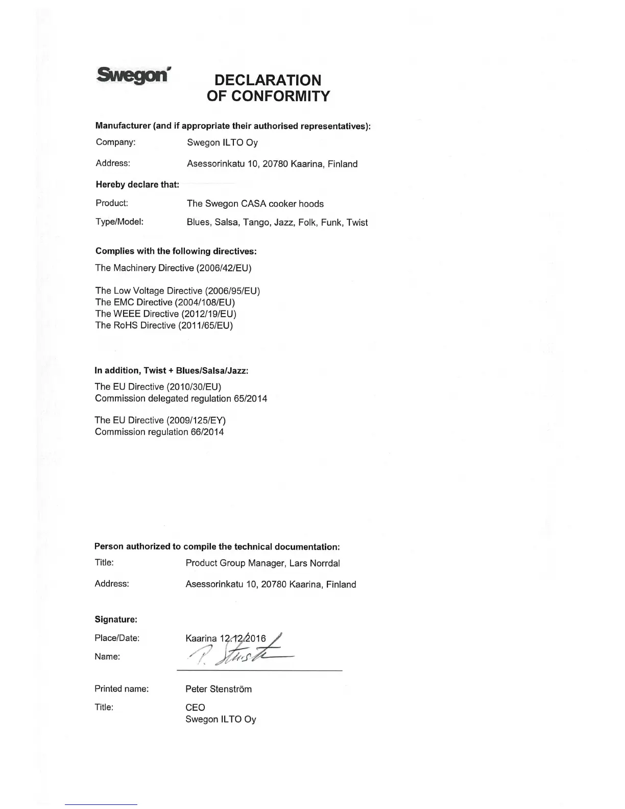 Swegon casa tango - EU-Erklæring Om Samsvar
