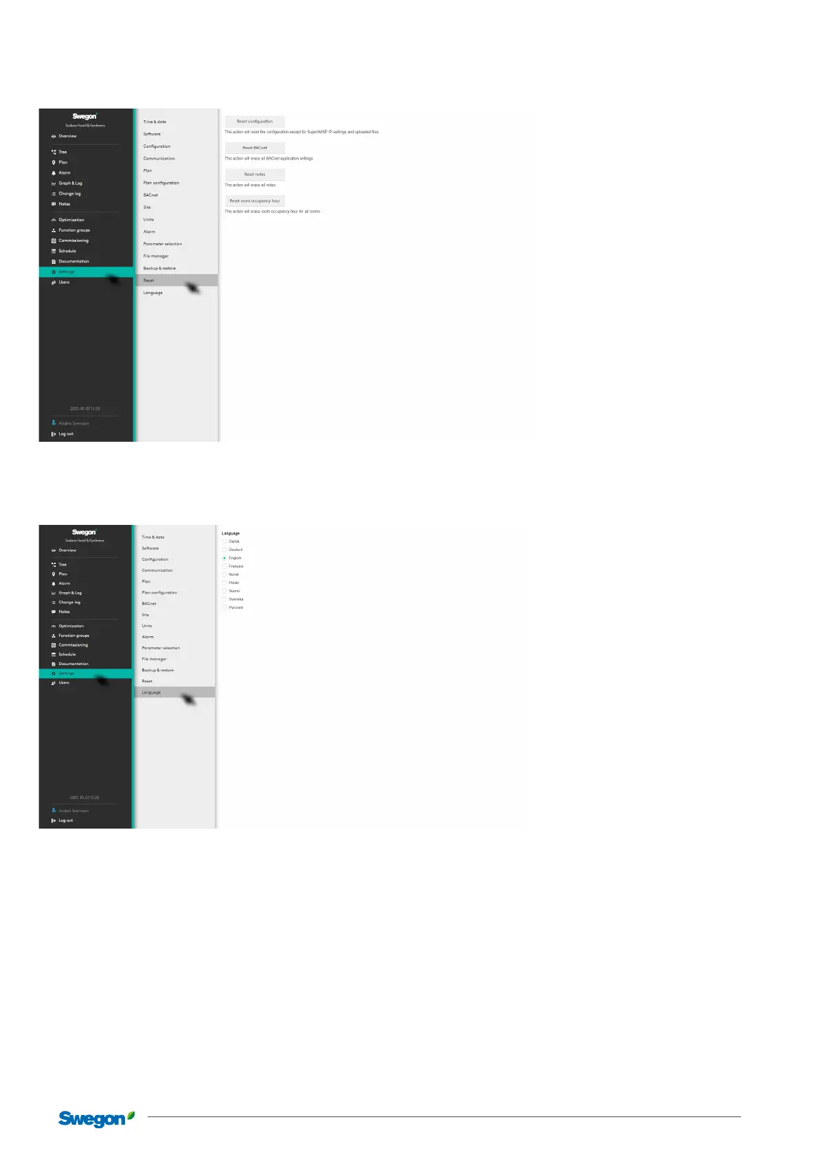Set the language required for the SuperWISE interface. Available languages are Swedish, Danish, German, English, French, Norwe-