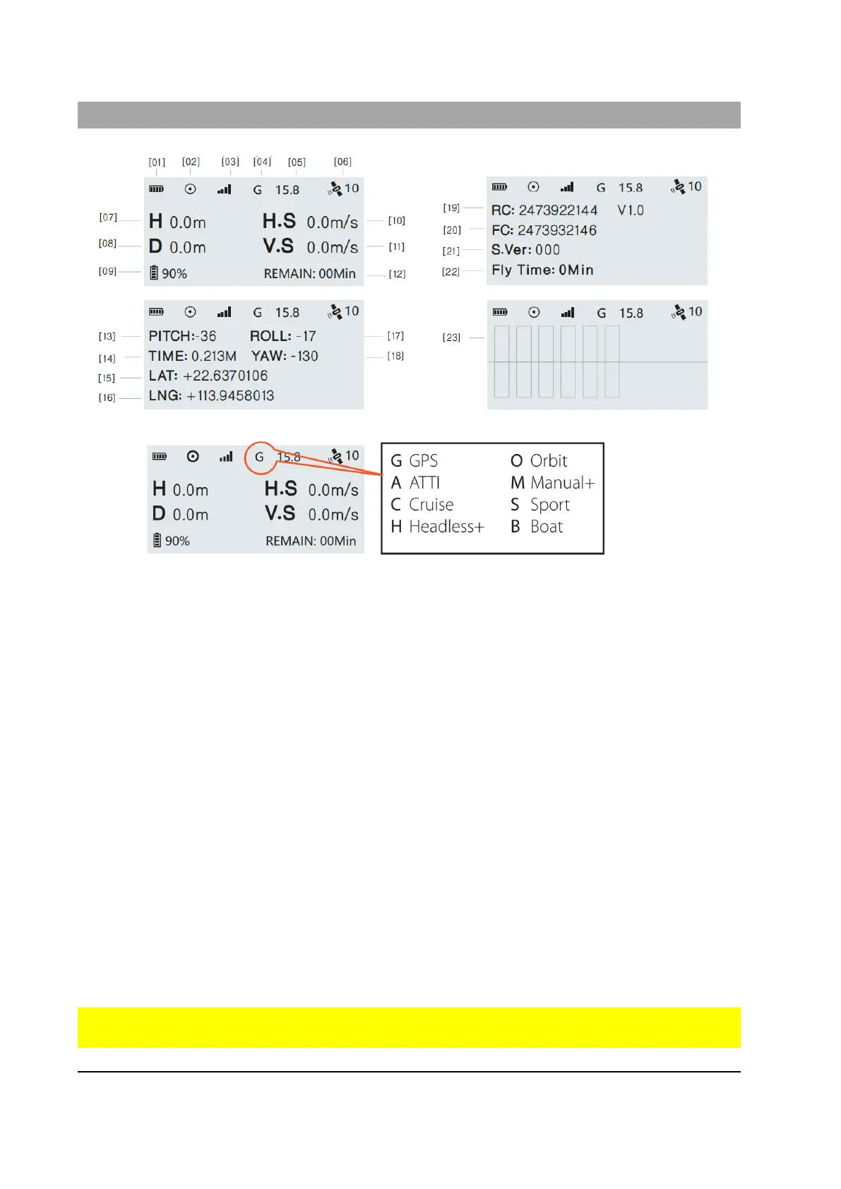 2. Flight Modes: G: GPS mode, A: ATTI mode, S: Sport mode, O: Orbit mode, H: