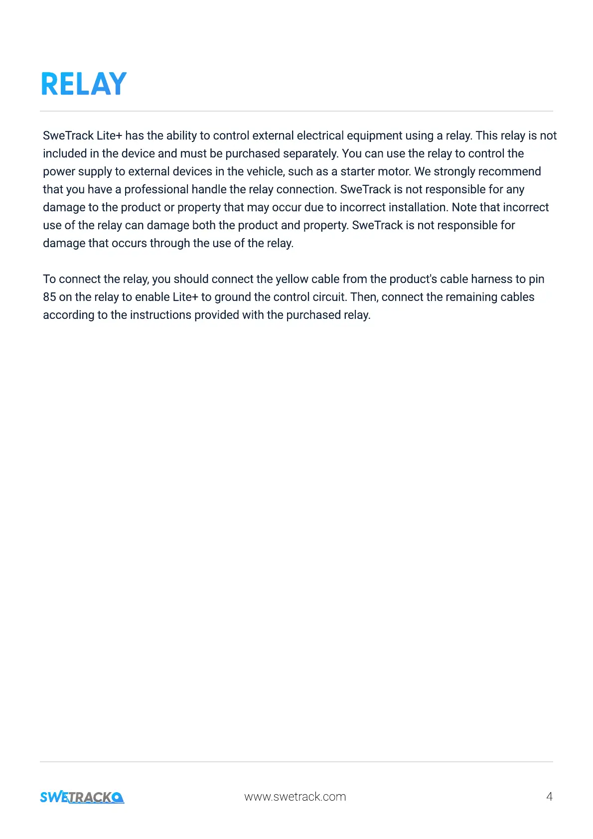 use of the relay can damage both the product and property. SweTrack is not responsible for