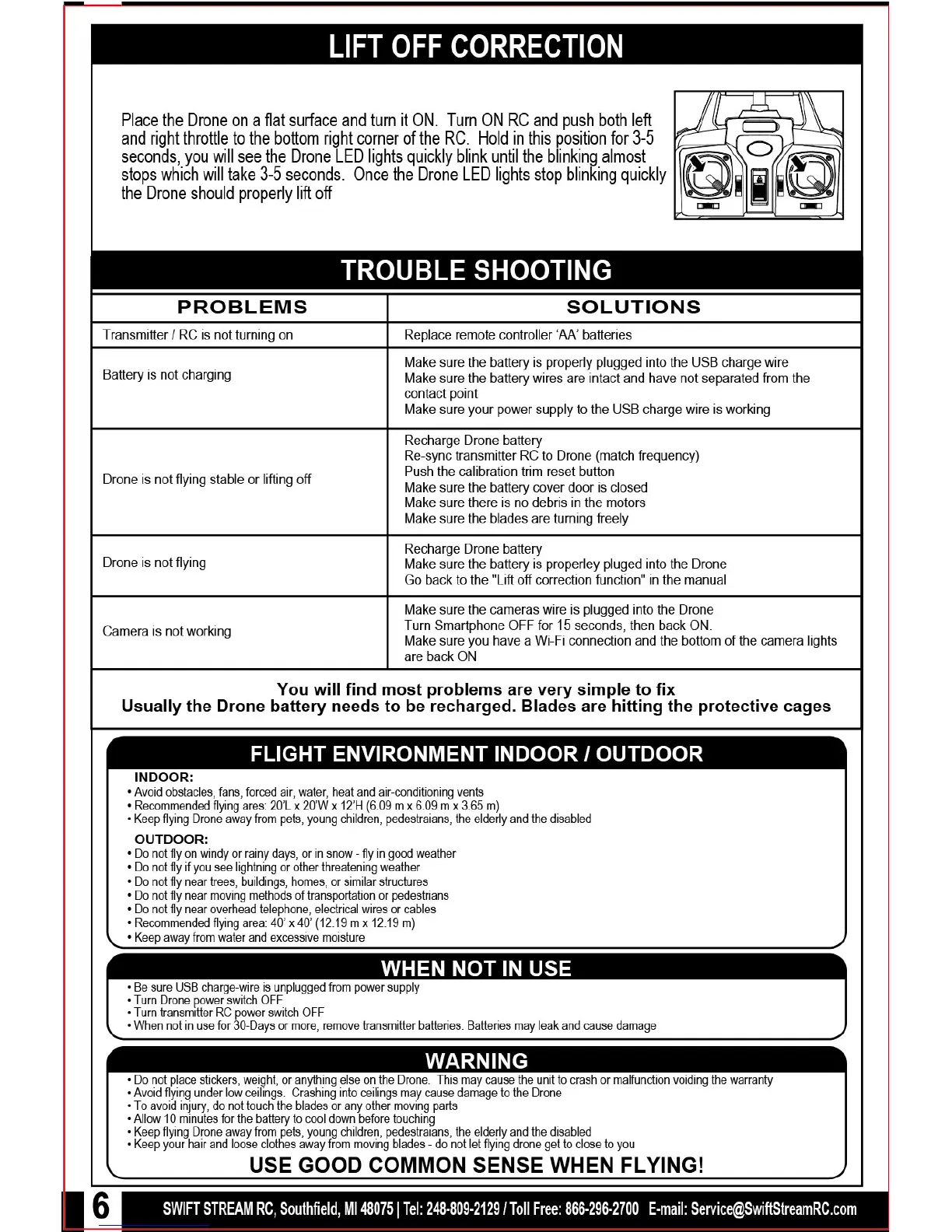 Swift Stream Z-9 Drone - Operation, Troubleshooting, and Safety; Troubleshooting Common Problems; General Safety Warnings