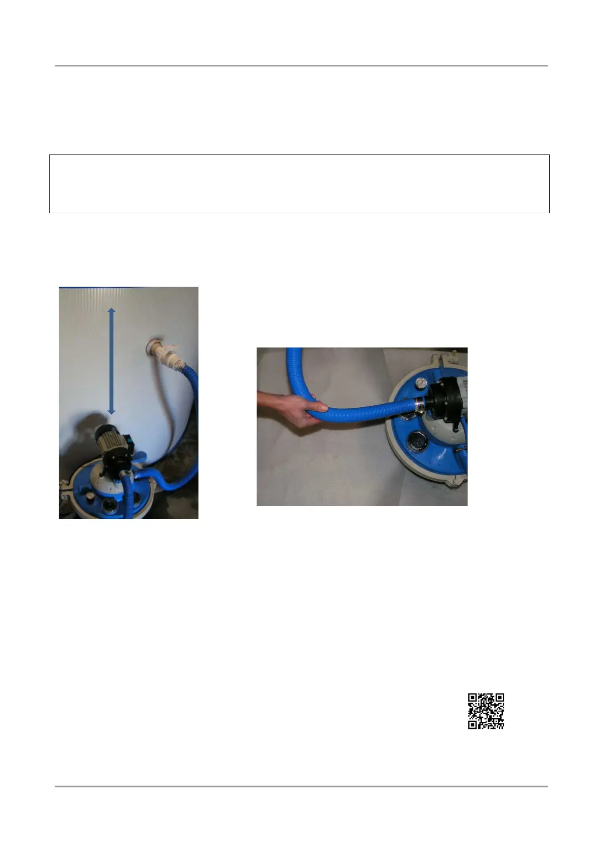 Slangarna skall förberedas genom att fylla sandfiltret plus slangar med vatten. Lyft slangar upp över