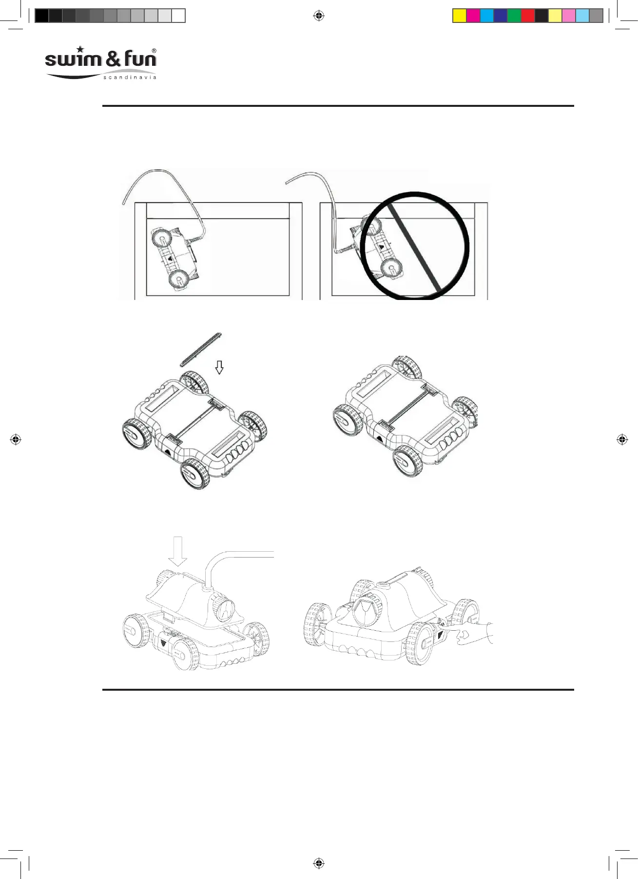 När roboten sätts ned och tas upp från poolen ska botten placeras mot väggen för att undvika