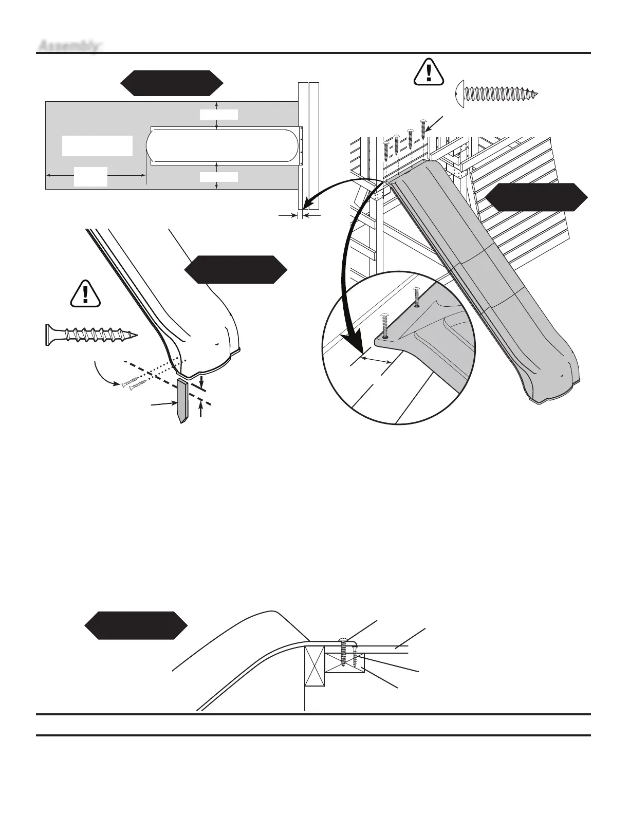 Important: Slide has four individual dimples. Use one screw at each dimple. Avoid locating dimples over any gaps in the playset deck.