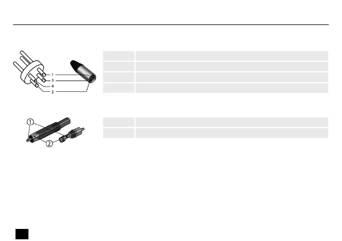 Drawing and table indicate the pin assignment of an RCA plug.