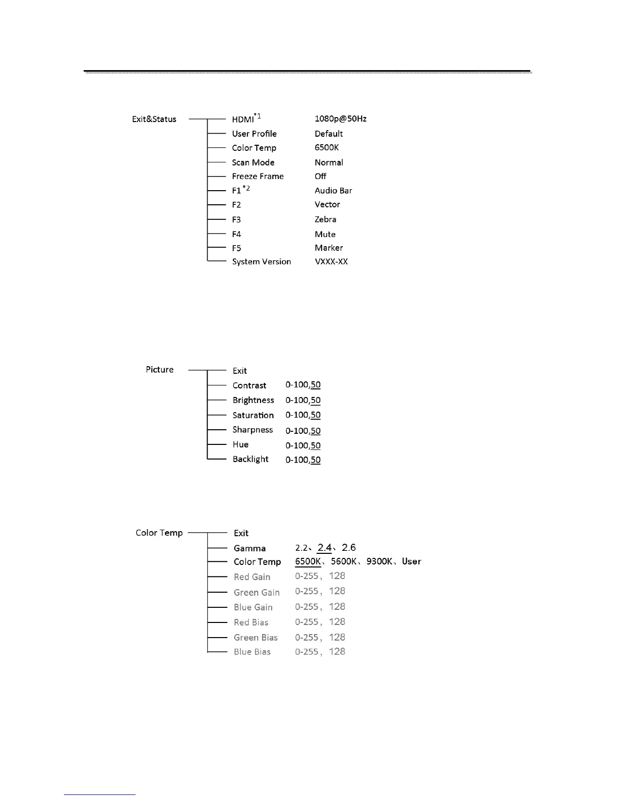 * Only “Color Temp” is set to “User”, the Red/Blue/Green Gain or Red/Blue/Green Bias can