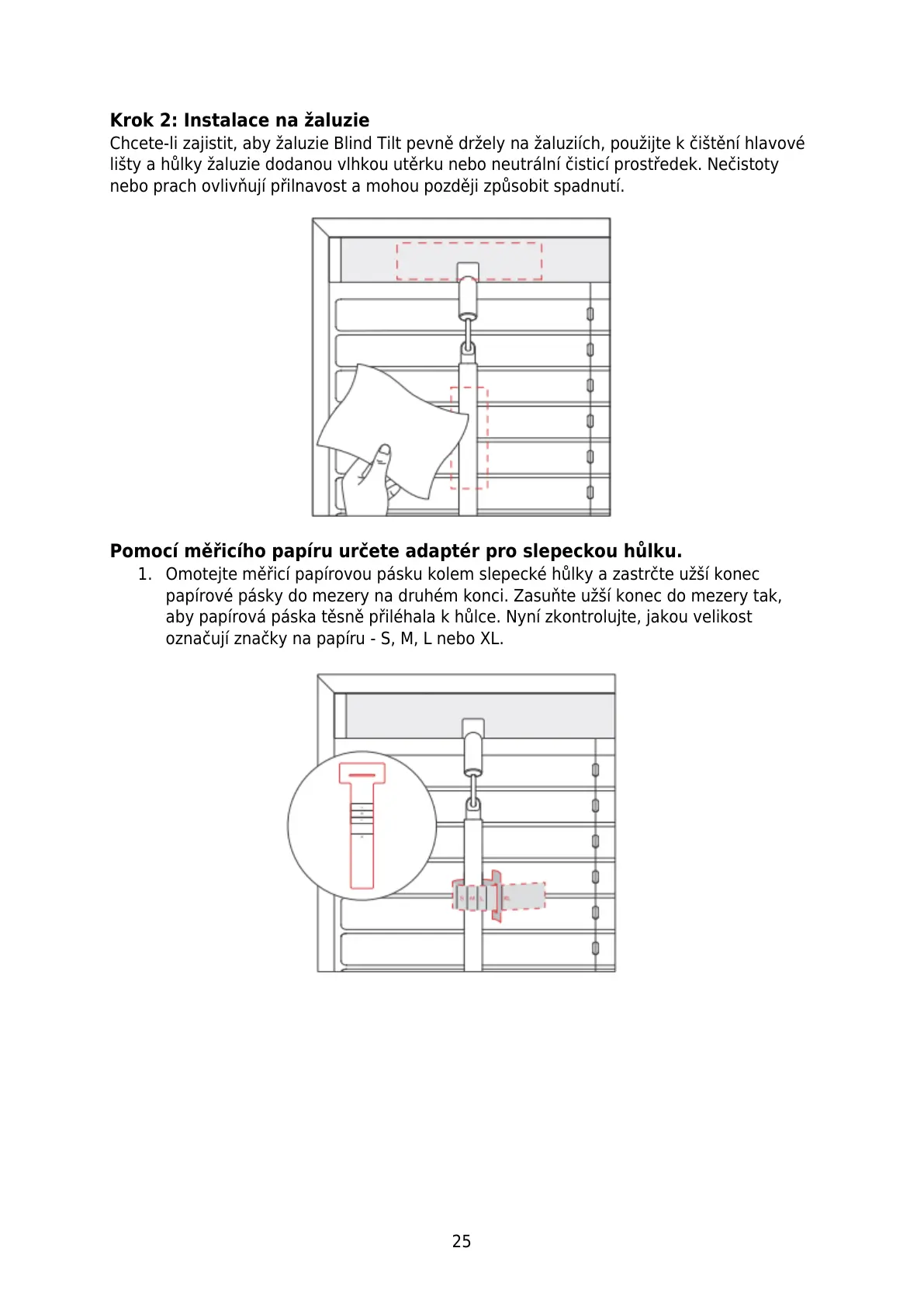 Chcete-li zajistit, aby žaluzie Blind Tilt pevně držely na žaluziích, použijte k čištění hlavové