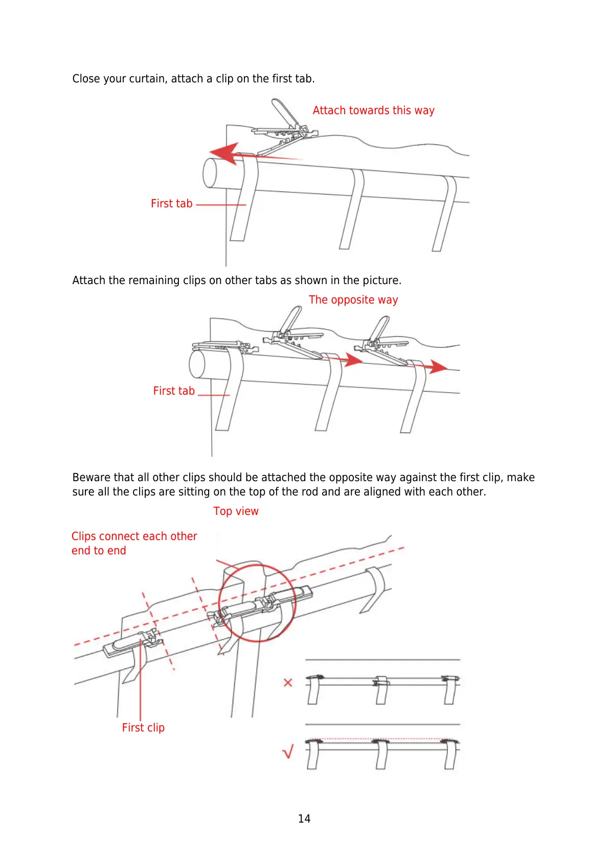 Beware that all other clips should be attached the opposite way against the first clip, make