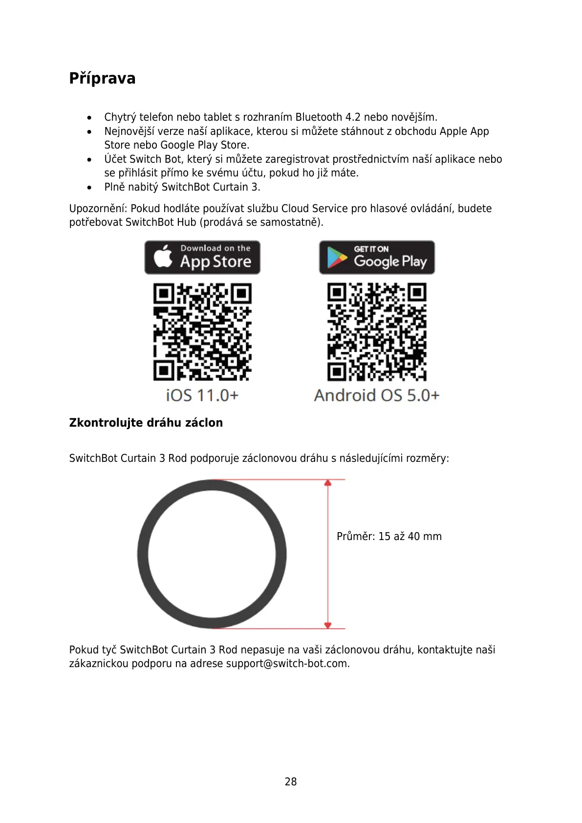 SwitchBot Curtain 3 Rod podporuje záclonovou dráhu s následujícími rozměry: