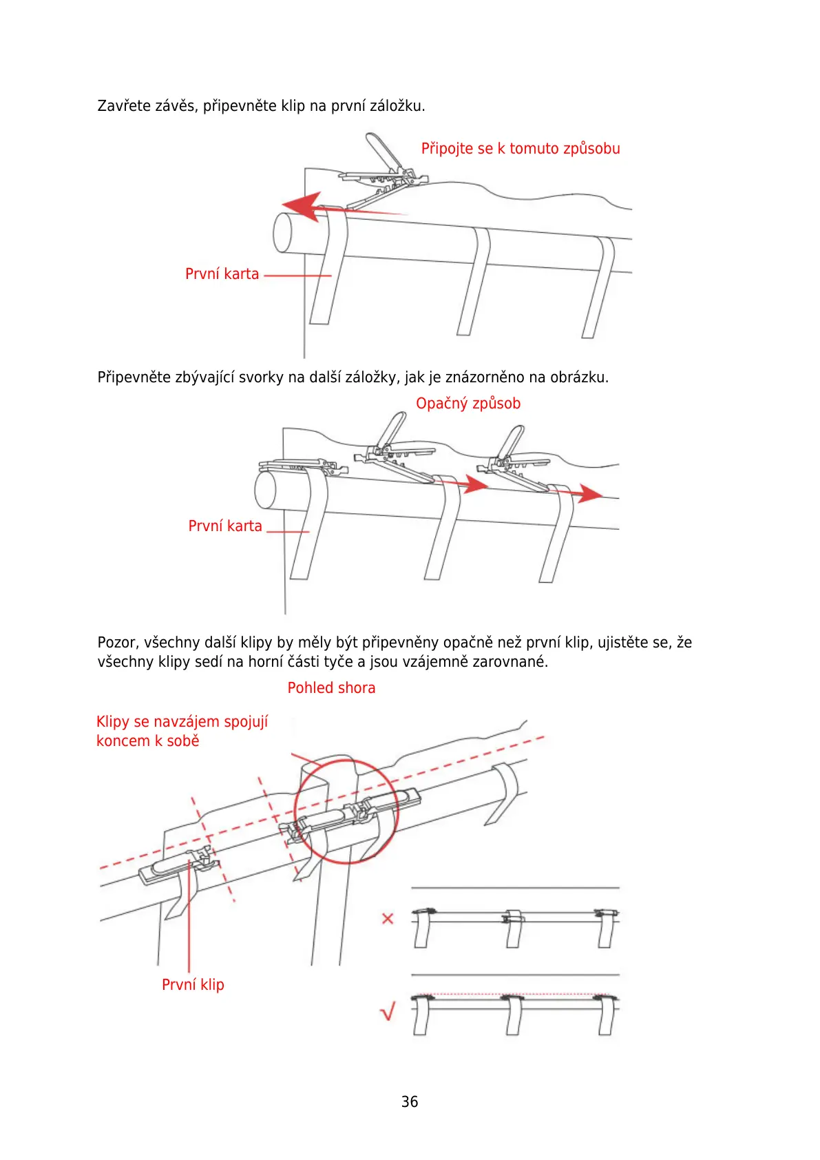 všechny klipy sedí na horní části tyče a jsou vzájemně zarovnané.