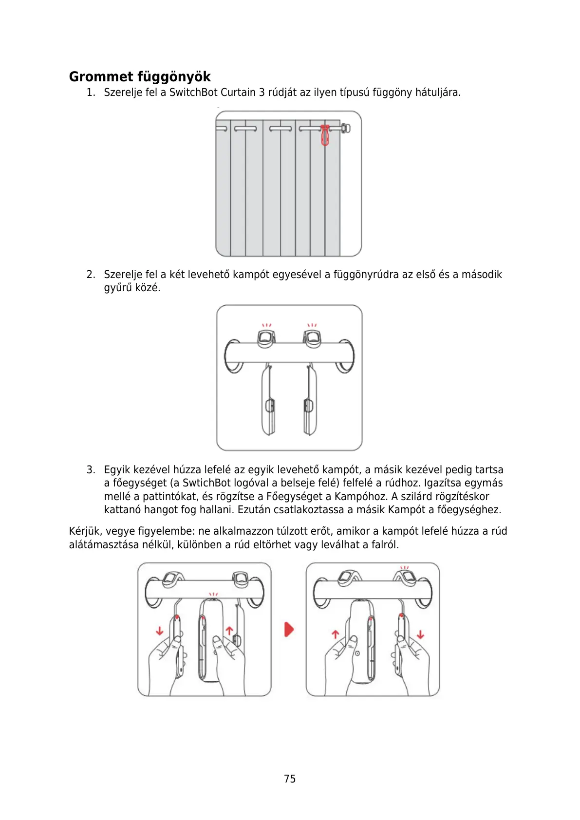 2. Szerelje fel a két levehető kampót egyesével a függönyrúdra az első és a második
