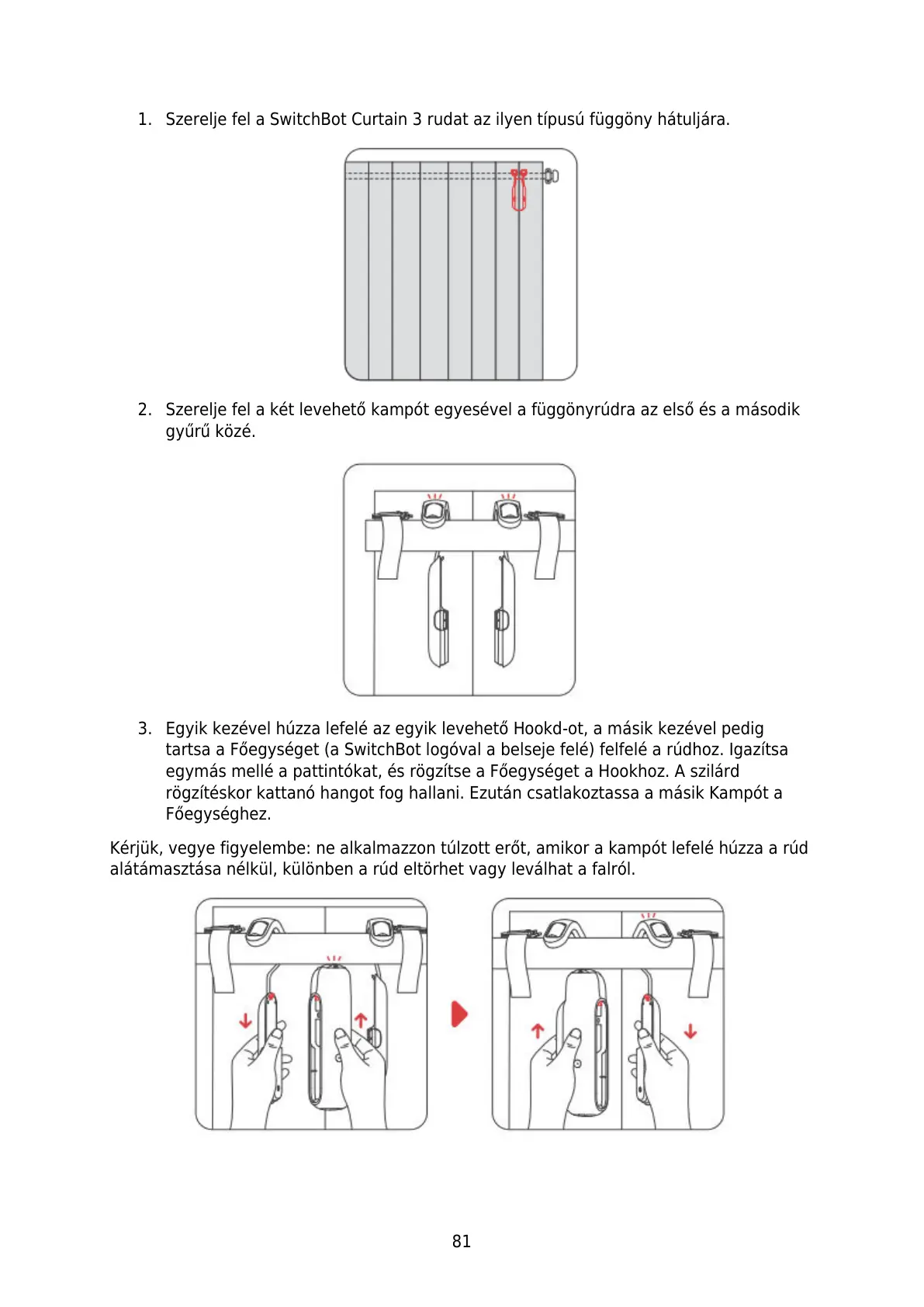 2. Szerelje fel a két levehető kampót egyesével a függönyrúdra az első és a második