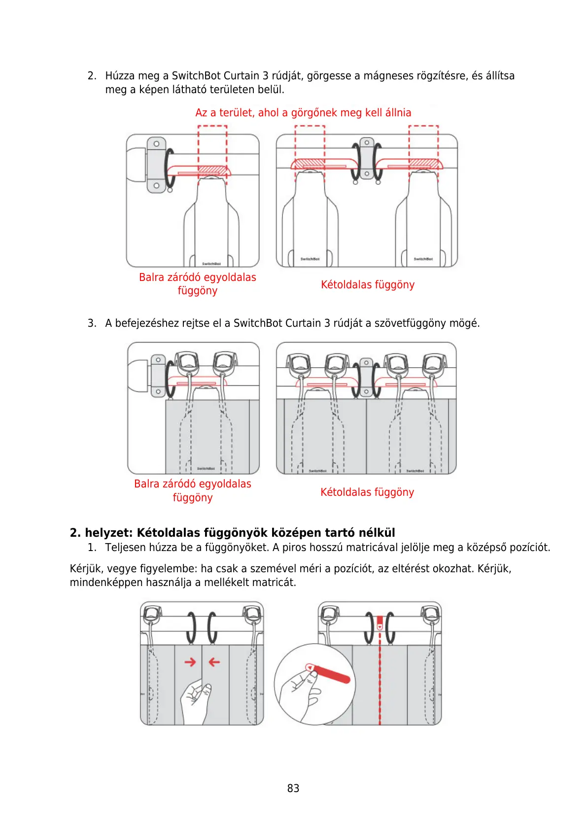 1. Teljesen húzza be a függönyöket. A piros hosszú matricával jelölje meg a középső pozíciót.