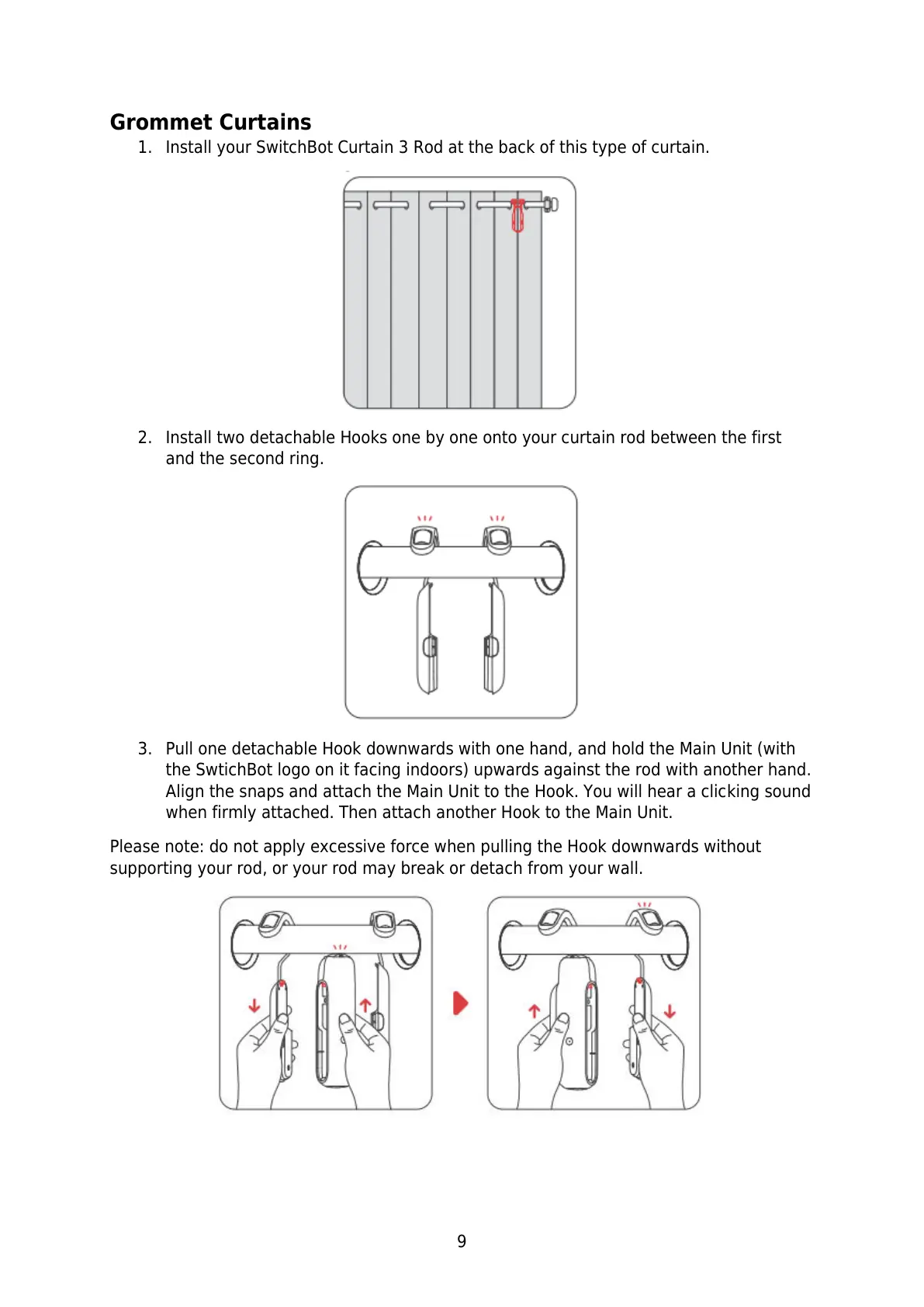the SwtichBot logo on it facing indoors) upwards against the rod with another hand.
