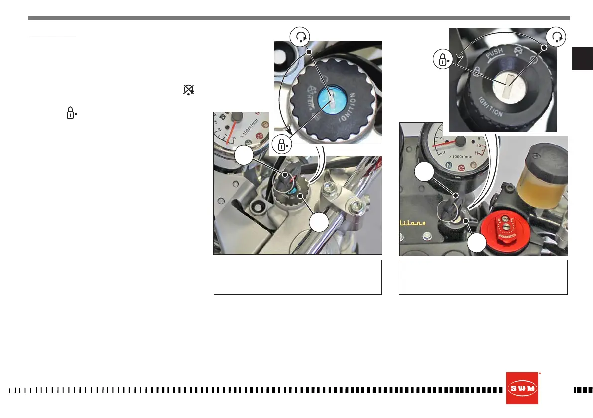 - Insert key (2) in the ignition switch (1) set to