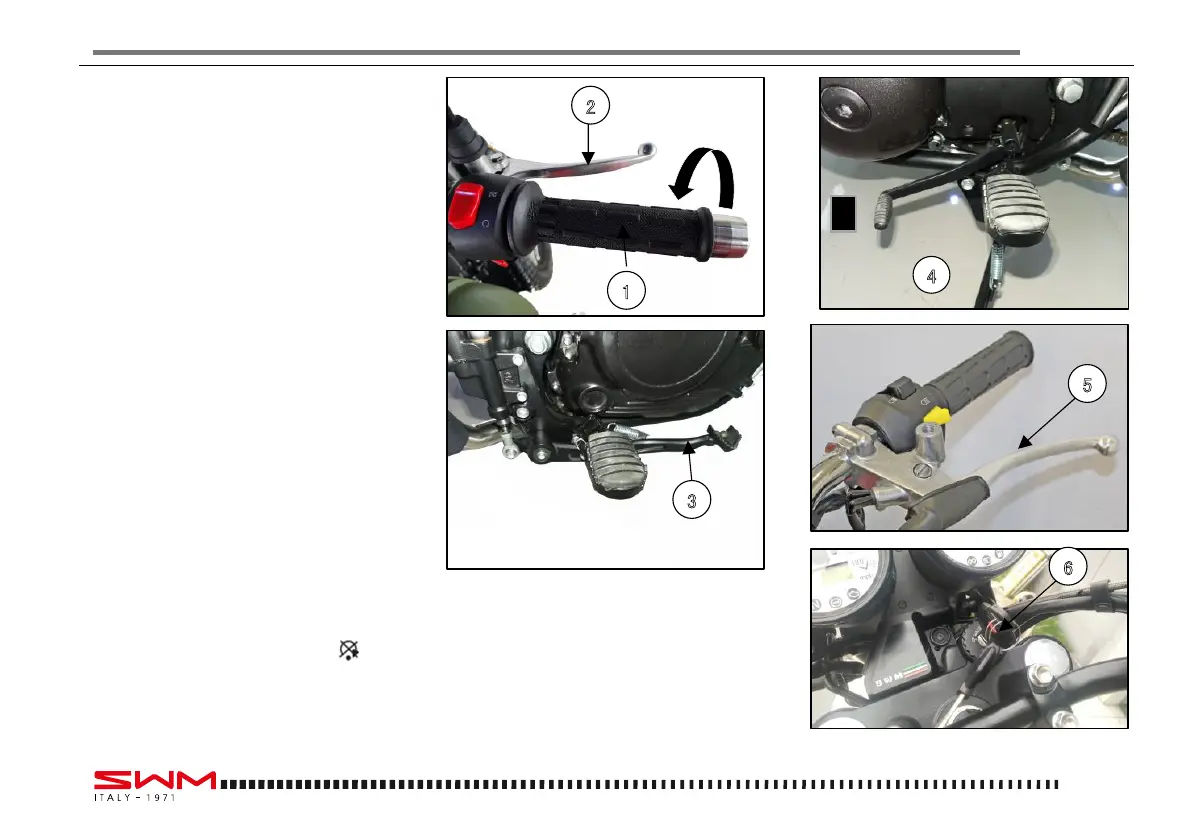 - When stopped, pull the clutch lever (4) and shift