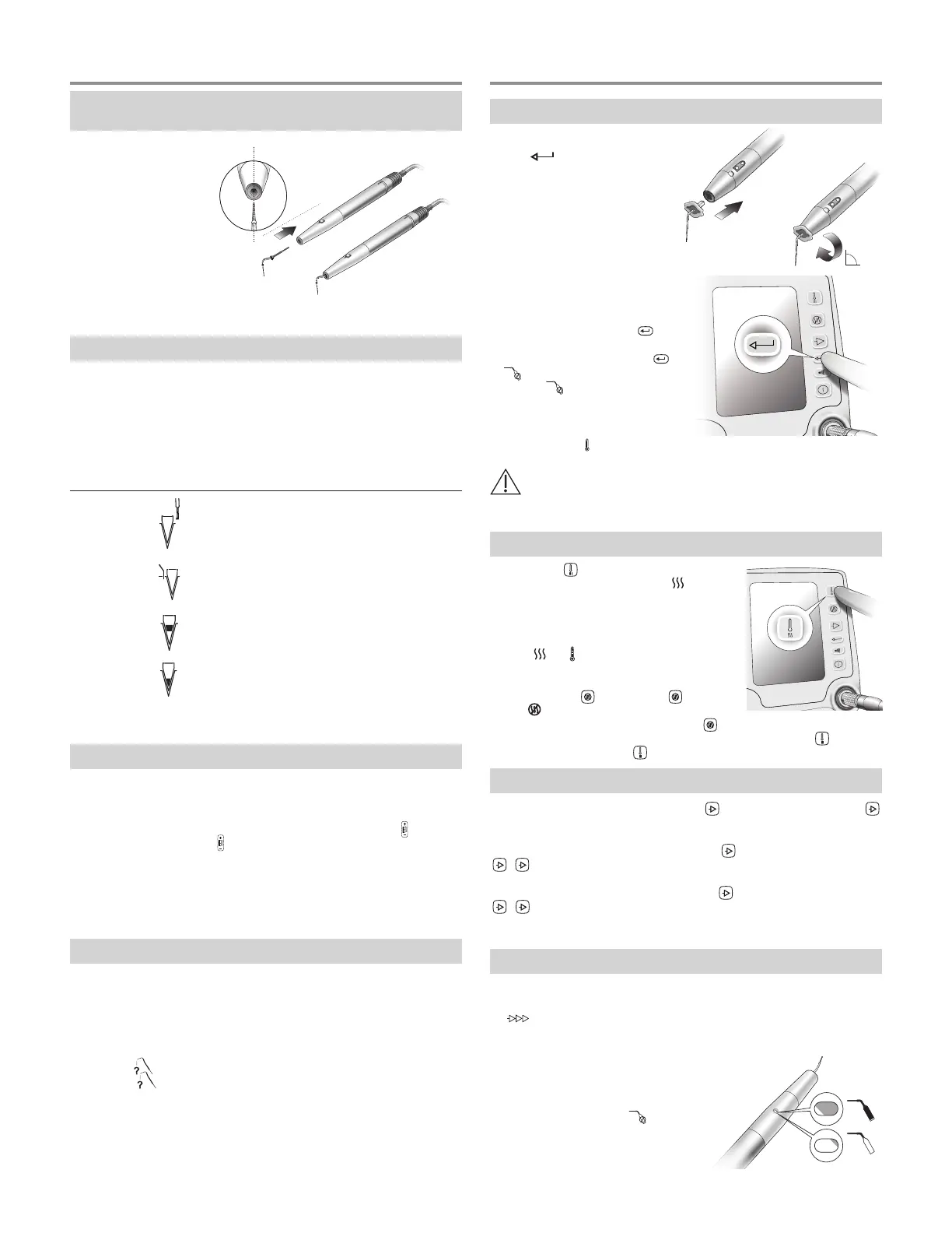 Atpakaļiepildes un Piededzināšanas režīmā. Uzgaļi, kas paredzētai pulpas pārbaudei uz karstumu,
