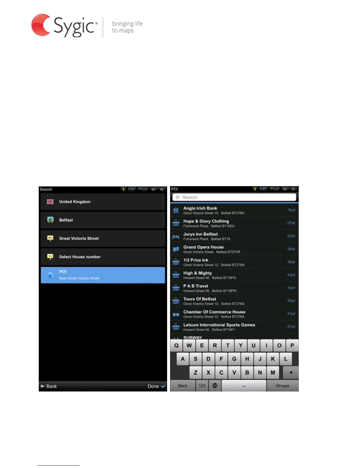 - Menu > Navigate to… > Nearby POI shows a list of POIs near your current