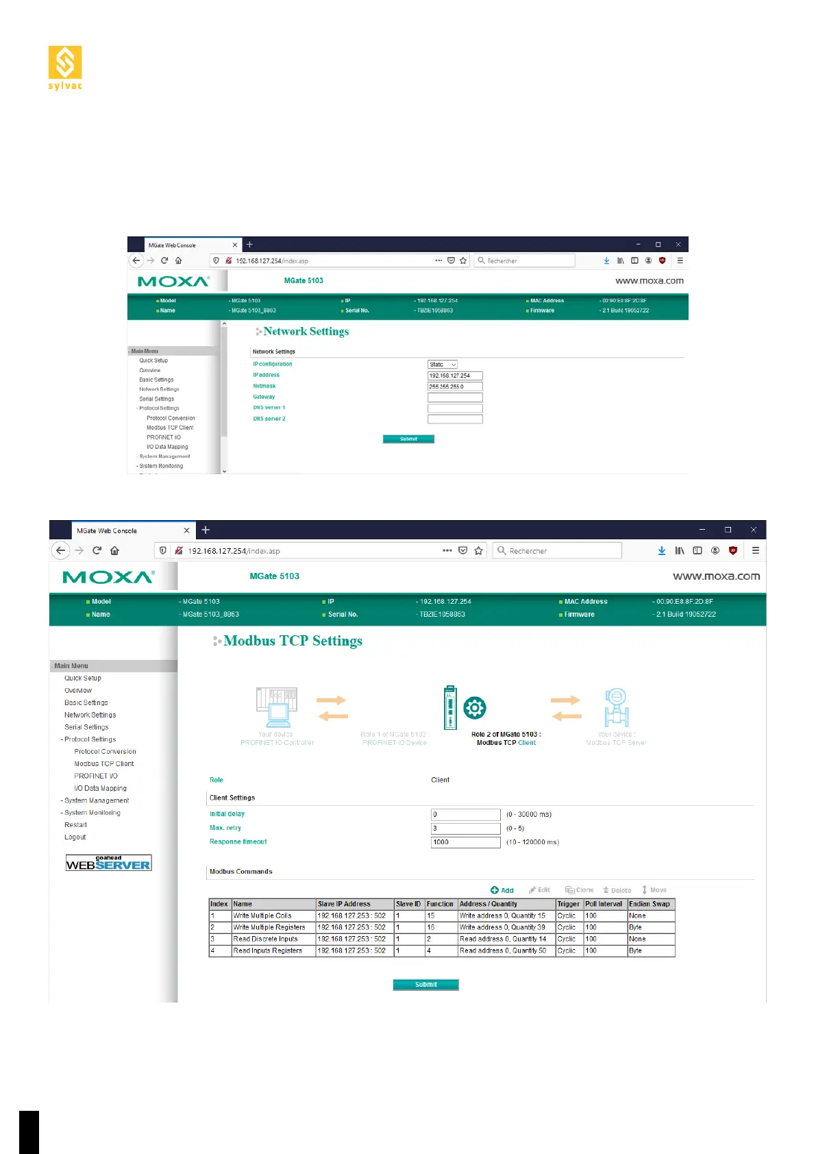 is necessary to modify the IP address of the gateway, as well as the parameters of the four ModbusTCP com-