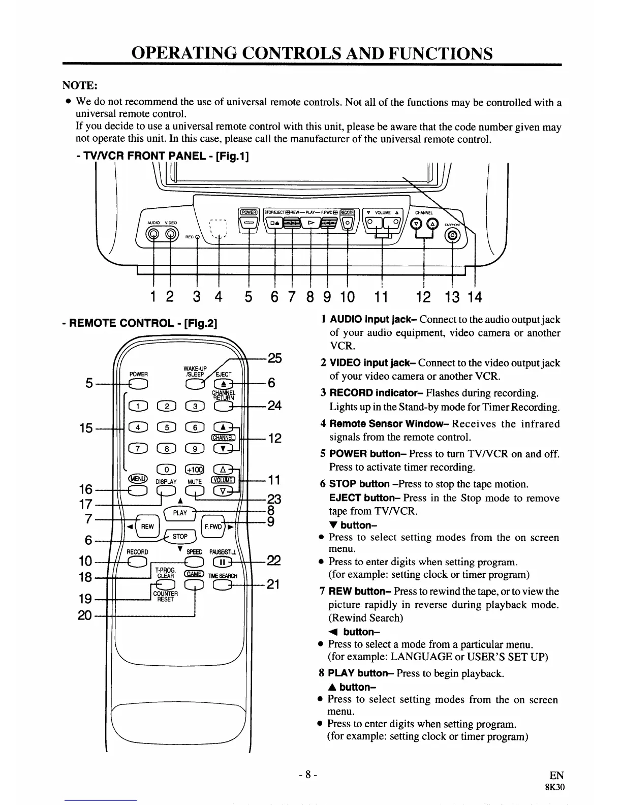 Sylvania 3909LC - OPERATING CONTROLS AND FUNCTIONS; TV;VCR Front Panel; Remote Control Functions