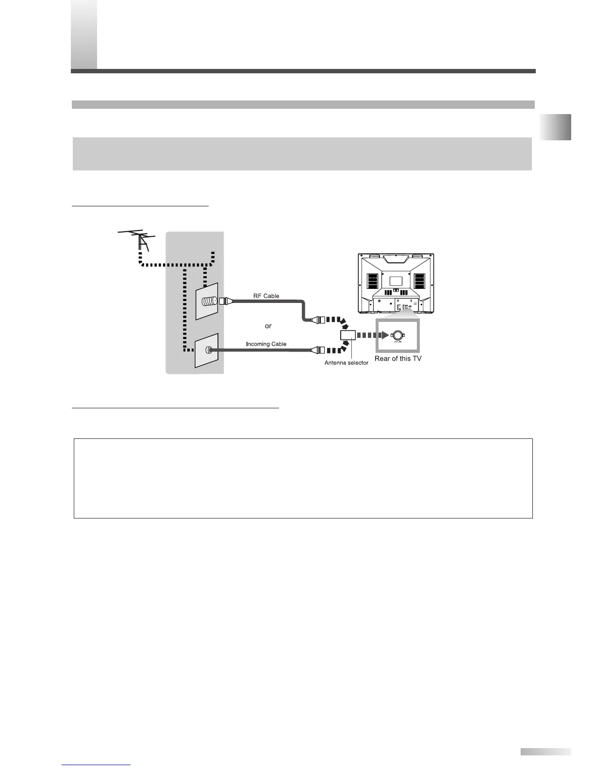 1) Connect the RF cable or antenna cable on your home outlet to the ANT. IN jack of this TV.