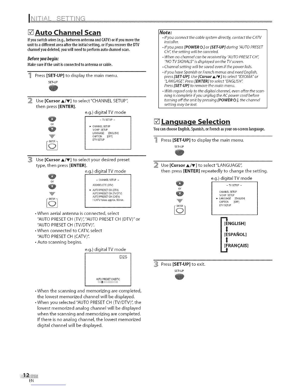 "AUTO PRESET CH (TV)", "AUTO PRESET CH (DTV)" or