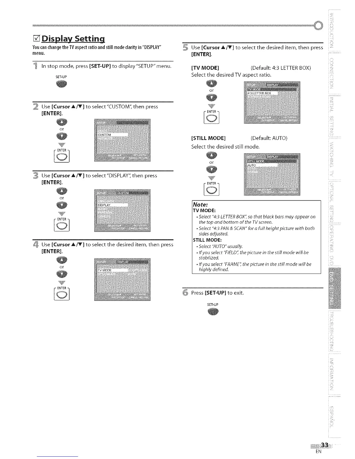 YoucanchangetheTVaspectratioandstill modeclarityin"DISPLAY" _, Use [Cursor A IV] to select the desired item, then press
