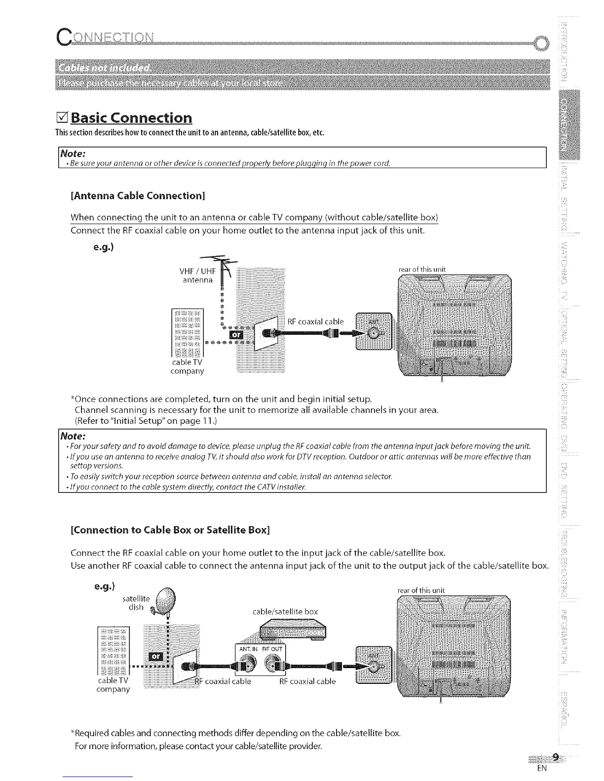 Thissectiondescribeshowto connectthe unit toan antenna, cable/sateJlJtebox,etc.