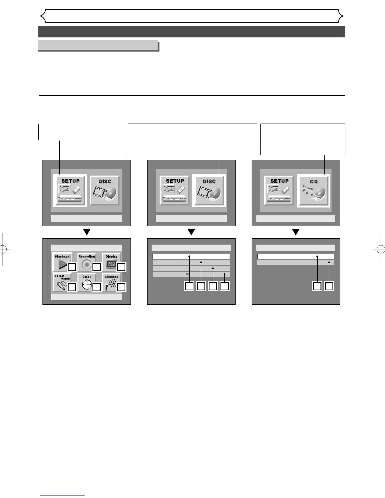This unit uses the following types of display for most operations. SETUP/DISC/CD menu,Title list, and DIS-