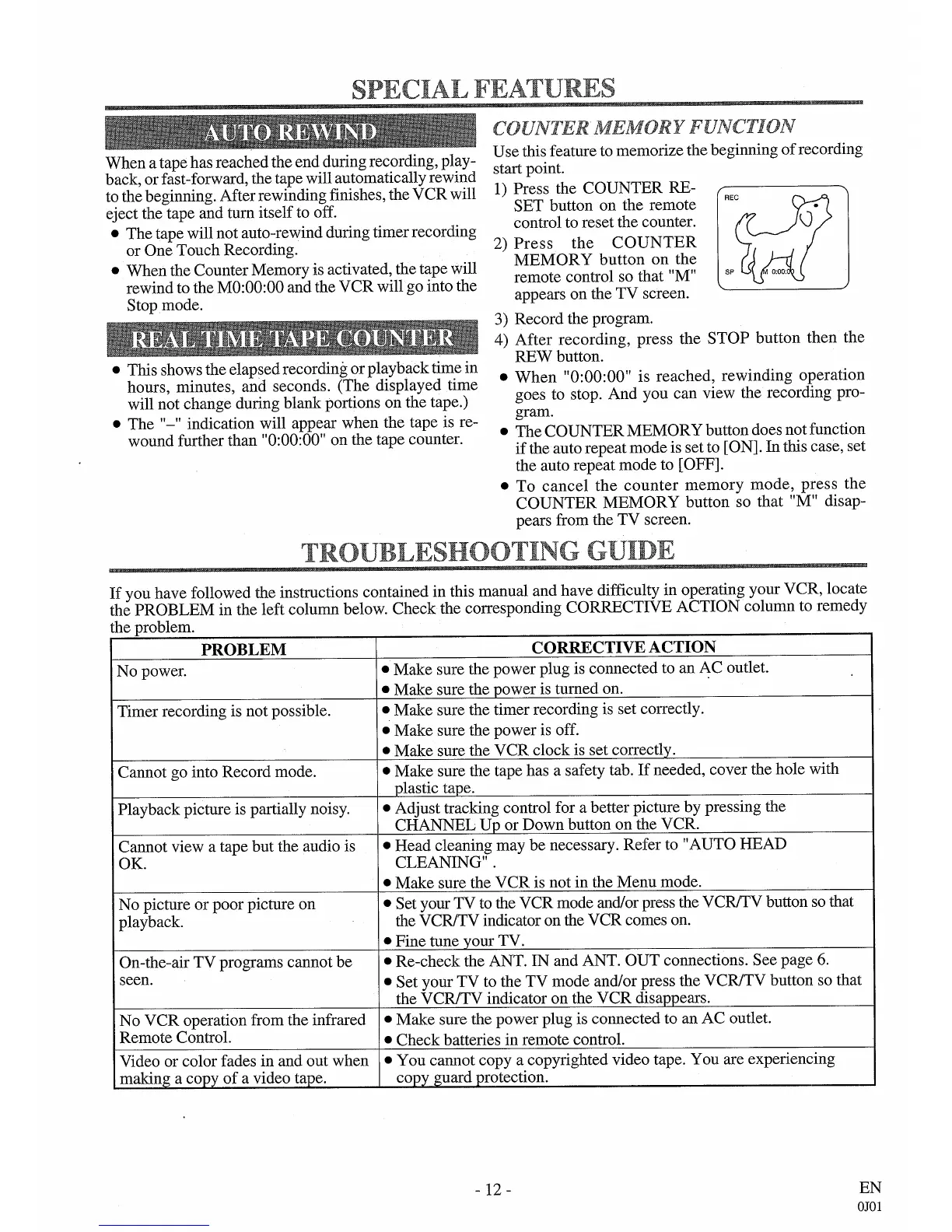 Sylvania KVS600 - Special Features; Troubleshooting Guide; Auto Rewind; Real Time Tape Counter