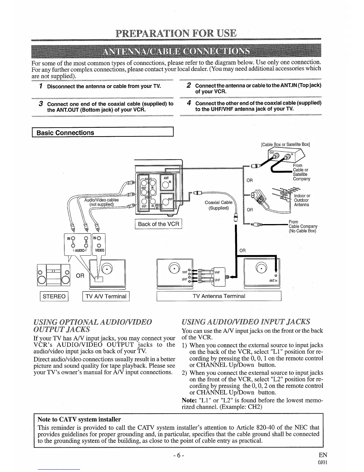 Sylvania KVS600 - Preparation for Use; Antenna;Cable Connections; Using Optional Audio;Video Output Jacks; Using Audio;Video Input Jacks
